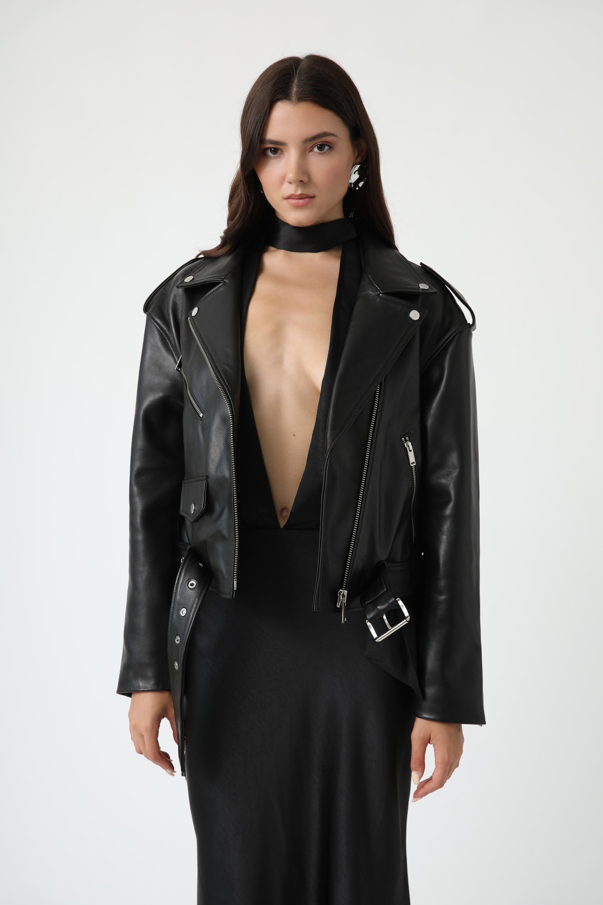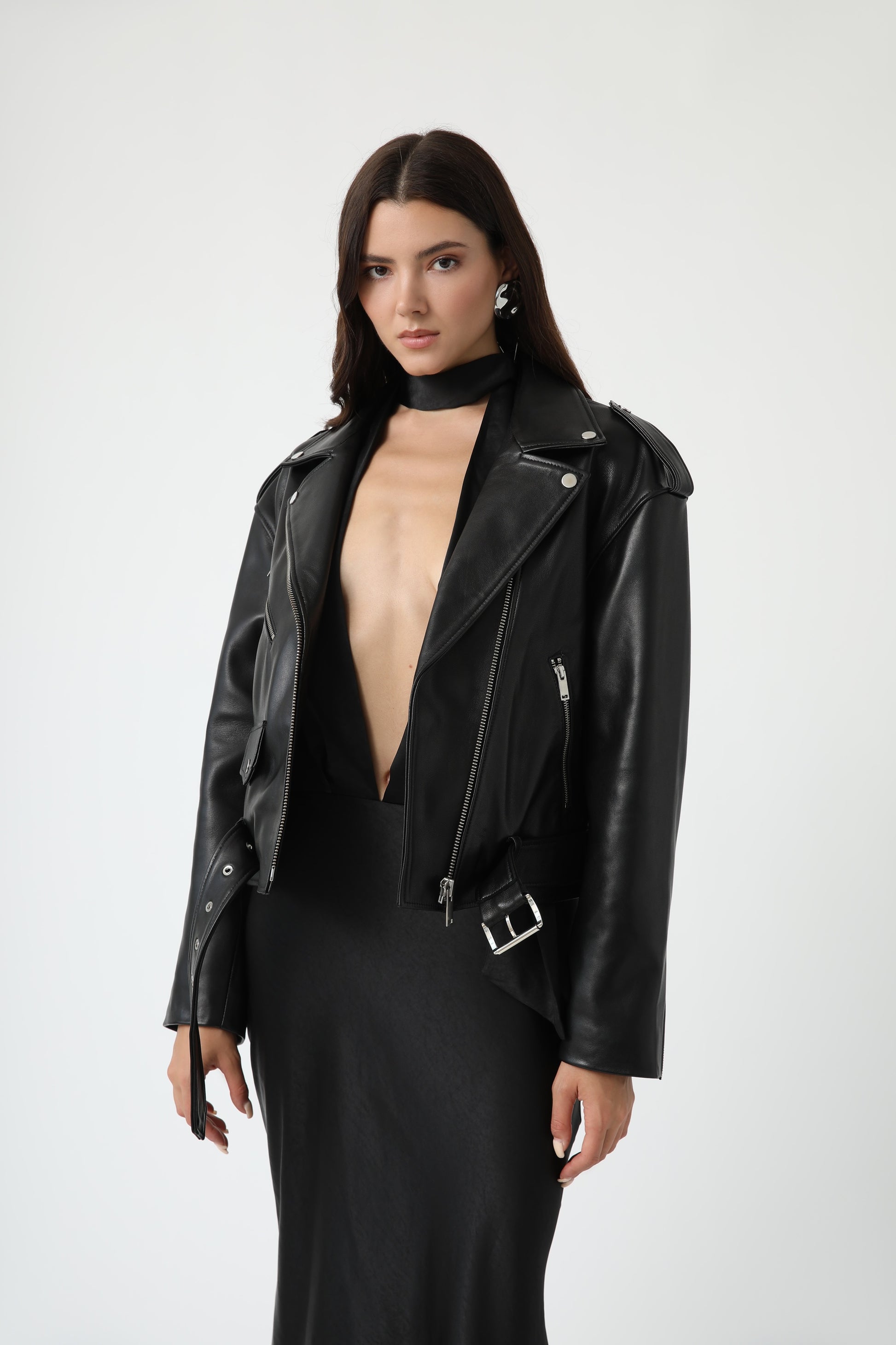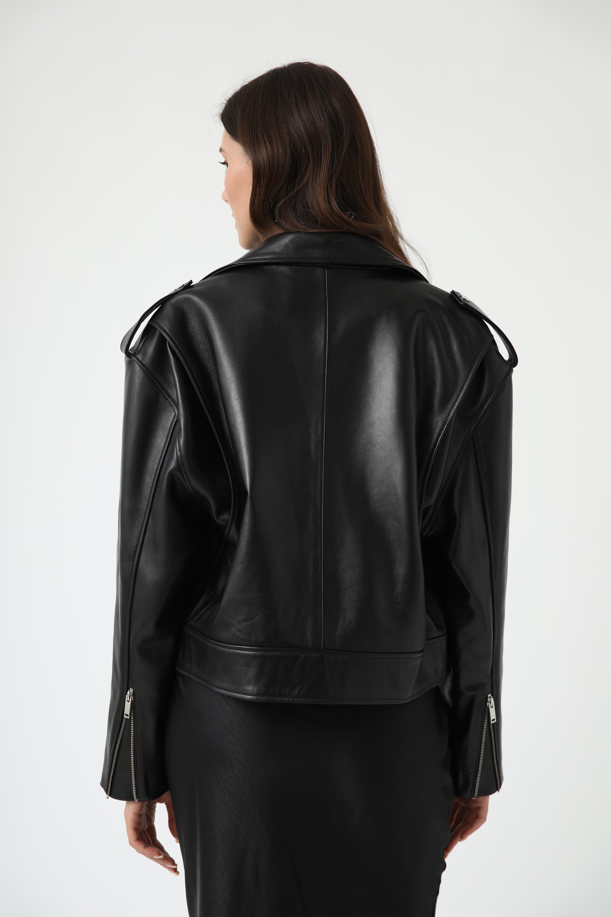 Cropped leather biker jacket with bold, sculpted lines. 100% Leather.