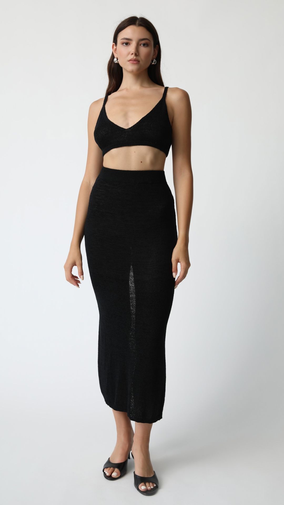 A ribbed black maxi skirt with a flattering fit. Pairs perfectly with the Éclat Top. 60% acrylic, 40% nylon.