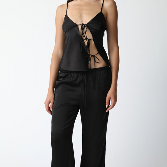 Black pants with front tie detail. 55% Polyester, 45% Rayon.